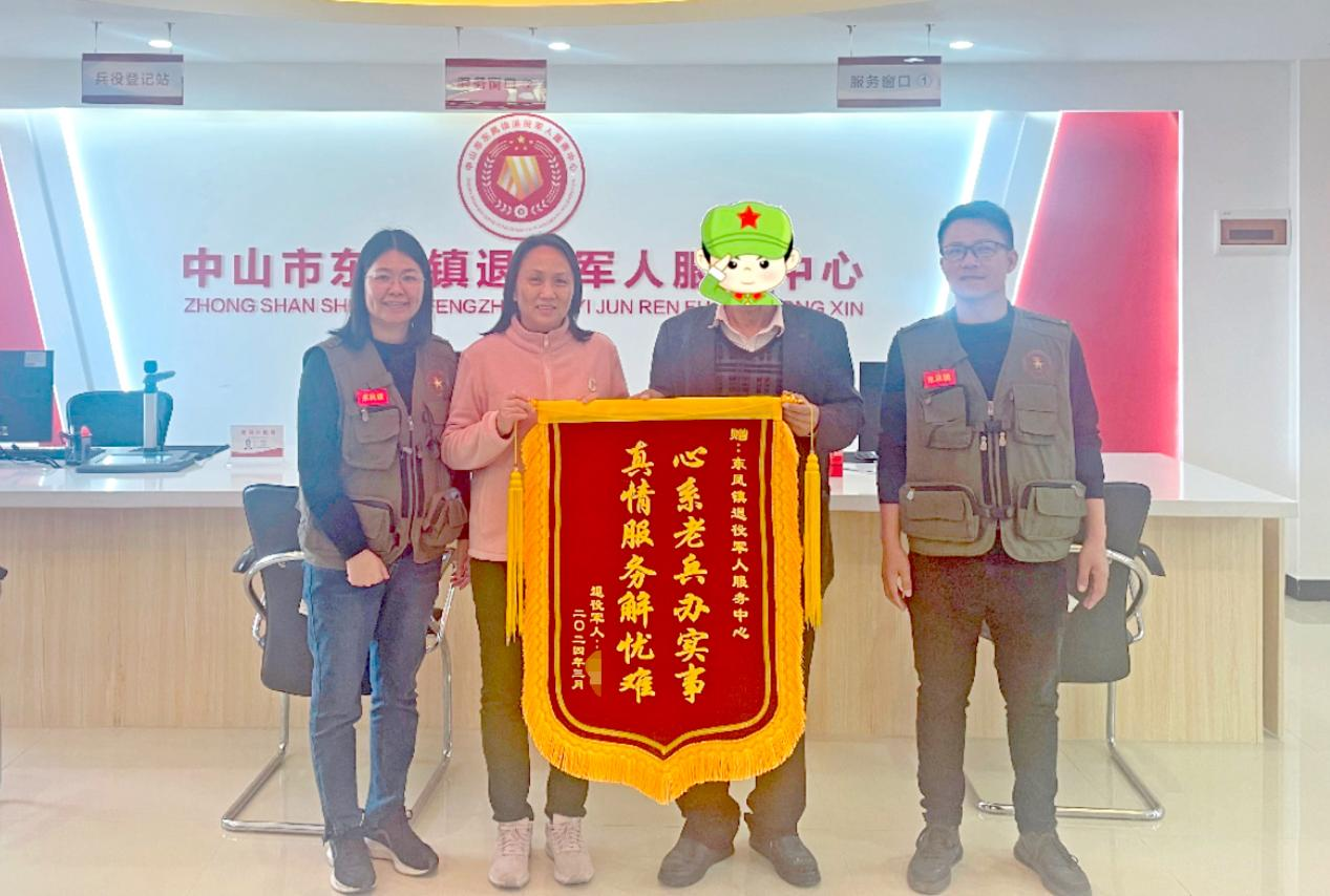 3月19日,中山市東鳳鎮(zhèn)小瀝社區(qū)退役軍人朱叔懷著感激之情,將一面印有“心系老兵辦實(shí)事,真情服務(wù)解憂(yōu)難”的錦旗送到東鳳鎮(zhèn)退役軍人服務(wù)中心,感謝該中心幫助其分別成功申請(qǐng)到廣東省應(yīng)急救助資金和中山市臨時(shí)困難補(bǔ)助,解決了他的燃眉之急,緩解了家庭困難。  退役軍人朱叔將一面印有“心系老兵辦實(shí)事,真情服務(wù)解憂(yōu)難”的錦旗送到東鳳鎮(zhèn)退役軍人服務(wù)中心。通訊員供圖