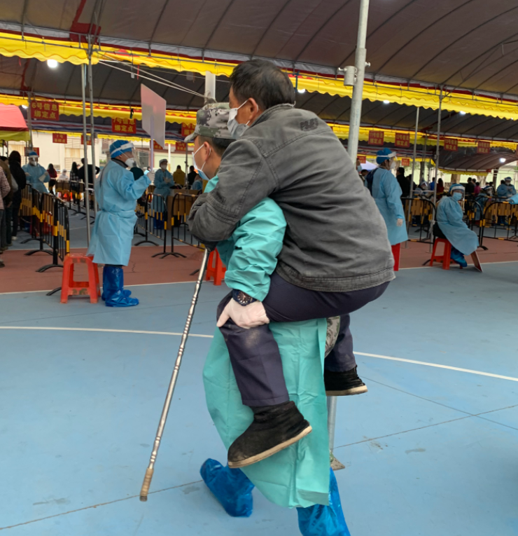 在小欖鎮(zhèn)聯(lián)豐社區(qū)核酸檢測采樣現(xiàn)場,退役軍人吳鴻文背起一位行動不便的老人前往核酸采樣工作臺,采樣結束后,將老人送出場外。臨走的時候老人連聲向他道謝。
