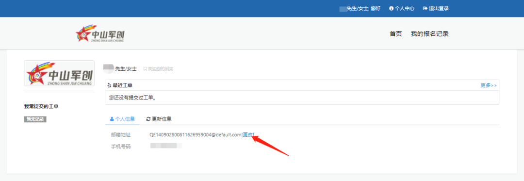 圖4 03 登錄信息 注冊成功后自動跳轉(zhuǎn)至登錄界面,填寫相應(yīng)信息后登錄賬號,進(jìn)入個(gè)人中心首頁,將系統(tǒng)默認(rèn)郵箱更改為個(gè)人常用郵箱,方便大賽執(zhí)委會通知發(fā)送。如圖5-6所示: