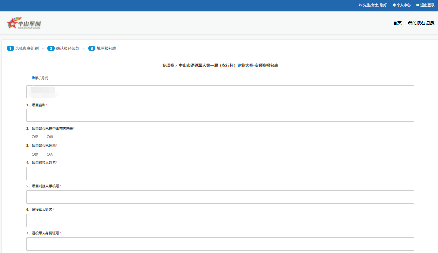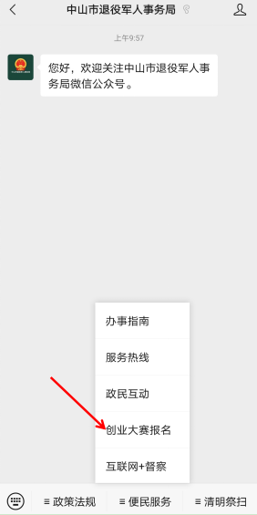 圖16 微信公眾號報(bào)名 01關(guān)注官方微信公眾號 微信搜索“中山市退役軍人事務(wù)局”或者掃描下方二維碼,即可關(guān)注公眾號。進(jìn)入“中山市退役軍人事務(wù)局”官方微信公眾號,在下方功能欄找到“便民服務(wù)”,點(diǎn)擊選擇“創(chuàng)業(yè)大賽報(bào)名”即可進(jìn)入報(bào)名系統(tǒng)。如圖17-19所示: