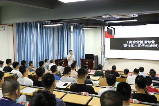 “狹路相逢勇者勝,在座的各位從繁忙的工作崗位上走出來,邁出繼續(xù)學(xué)習(xí)的關(guān)鍵一步,勇氣可嘉。三年后,相信大家一定會收獲知識、技能、學(xué)歷,更好地開啟新征程?!蓖艘圮娙爽F(xiàn)代學(xué)徒制項目開學(xué)典禮上,經(jīng)管學(xué)院院長肖紅在致辭中對新生們表示歡迎和祝賀,并表達(dá)了殷切期望,希望大家在求學(xué)期間,修德修身、克勤克儉、心懷理想,腳踏實地,融入多姿多彩的校園生活,在學(xué)生當(dāng)中彰顯軍人本色和榜樣力量。 市退役軍人事務(wù)局相關(guān)負(fù)責(zé)人對項目順利開班表示祝賀,對學(xué)院在項目申報、招生等工作中的辛勤付出表示衷心感謝。他介紹了項目實施的背景,指出開展退役軍人現(xiàn)代學(xué)徒制教育,是退役軍人安置工作的一項重要內(nèi)容,通過現(xiàn)代學(xué)徒制,讓大家成為全日制大學(xué)生,進行正規(guī)系統(tǒng)的高等職業(yè)教育,是黨和政府送給同學(xué)們的一份沉甸甸的“大禮包”。同時,要求新生們盡快適應(yīng)由士兵到大學(xué)生的角色轉(zhuǎn)變,勤學(xué)善思,掌握就業(yè)創(chuàng)業(yè)本領(lǐng),發(fā)揚軍隊能打勝仗的優(yōu)良傳統(tǒng),爭創(chuàng)佳績,為祖國和地方經(jīng)濟建設(shè)再立新功。 學(xué)院工商管理專業(yè)主任沈孟康介紹了學(xué)校和學(xué)院概況,就學(xué)生日常管理、教學(xué)內(nèi)容、方式和計劃等作詳細(xì)說明。表示學(xué)校將采取在崗培養(yǎng)與學(xué)校培養(yǎng)相結(jié)合,堅持“標(biāo)準(zhǔn)不降、模式多元、學(xué)制靈活”,線上與線下混合教學(xué),實行工學(xué)交替、靈活多元的教學(xué)模式。經(jīng)管學(xué)院已配備了教授、博士等“精銳”師資團,“量身定制”人才培養(yǎng)方案,全力保障“八一班”的教育教學(xué)質(zhì)量。