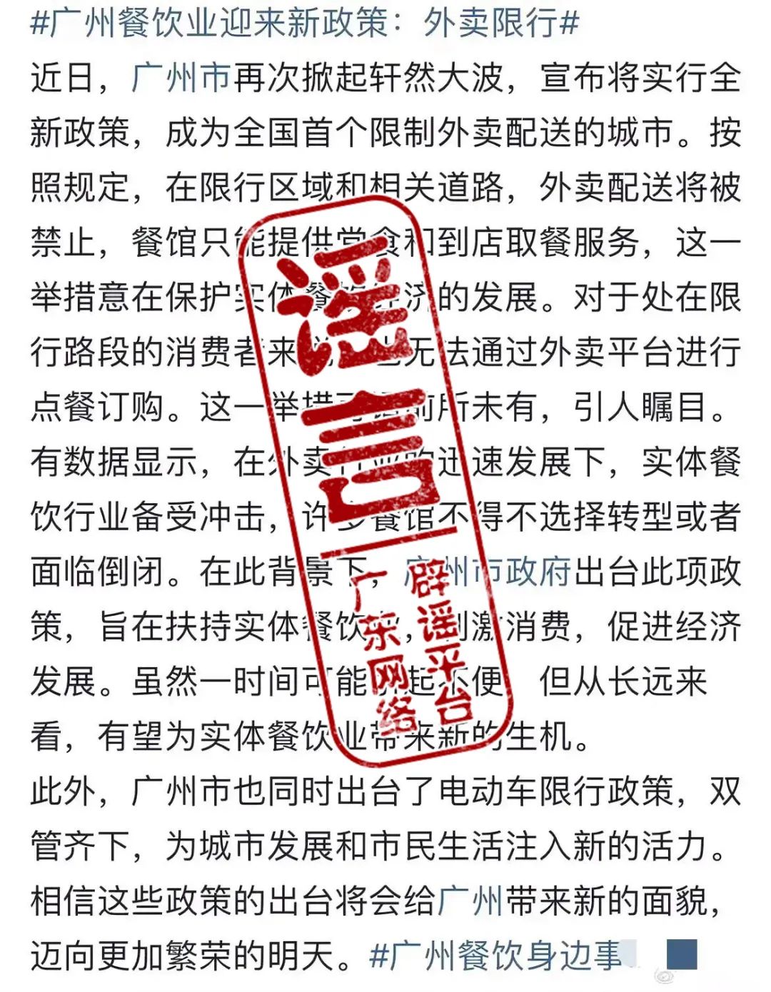 近日,有自媒體發(fā)布“廣州市將實行全新政策,成為全國首個限制外賣配送的城市”“限行區(qū)域和相關道路,外賣配送將被禁止,餐館只能提供堂食和到店取餐服務”,經(jīng)核查,上述信息嚴重不實,惡意曲解廣州電動自行車限行新規(guī),誤導民眾,引發(fā)不良社會影響。