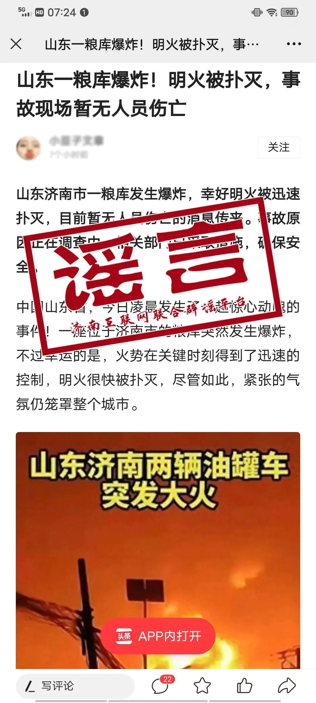 1月20日晚,有網(wǎng)民在社交平臺(tái)發(fā)布“山東濟(jì)南市一糧庫(kù)發(fā)生爆炸?;饎?shì)在關(guān)鍵時(shí)刻得到了迅速的控制,明火很快被撲滅,盡管如此,緊張的氣氛仍籠罩整個(gè)城市”消息,所配圖片顯示為“濟(jì)南兩輛油罐車(chē)突發(fā)大火”,引發(fā)了網(wǎng)友熱議。
