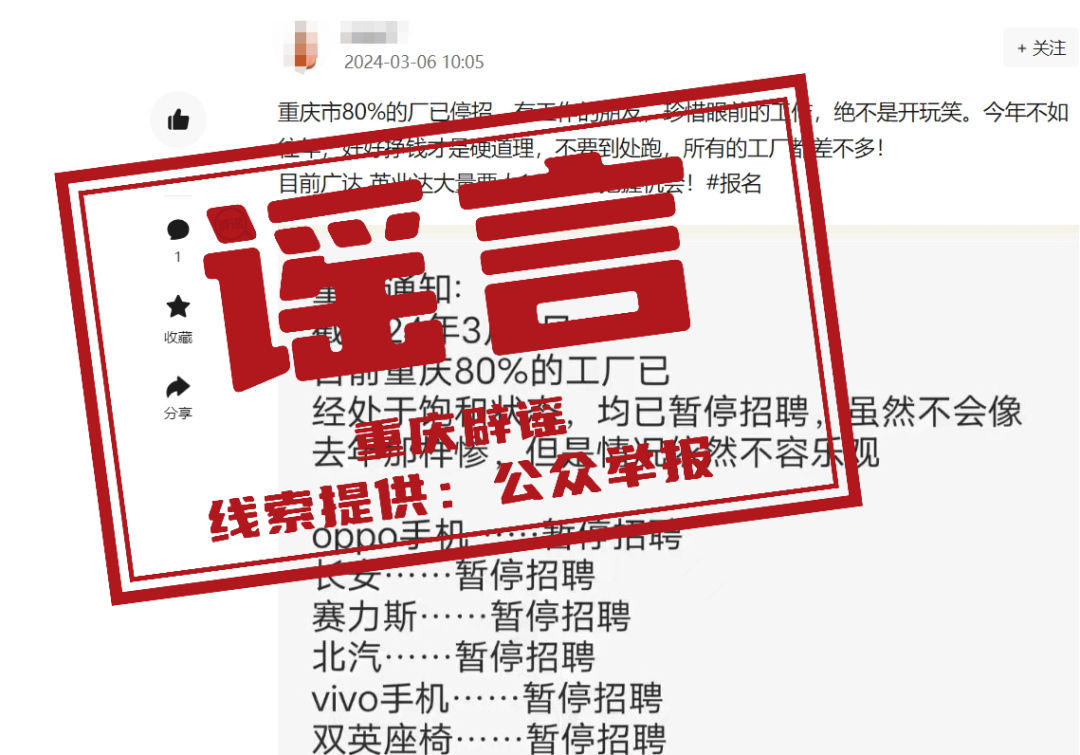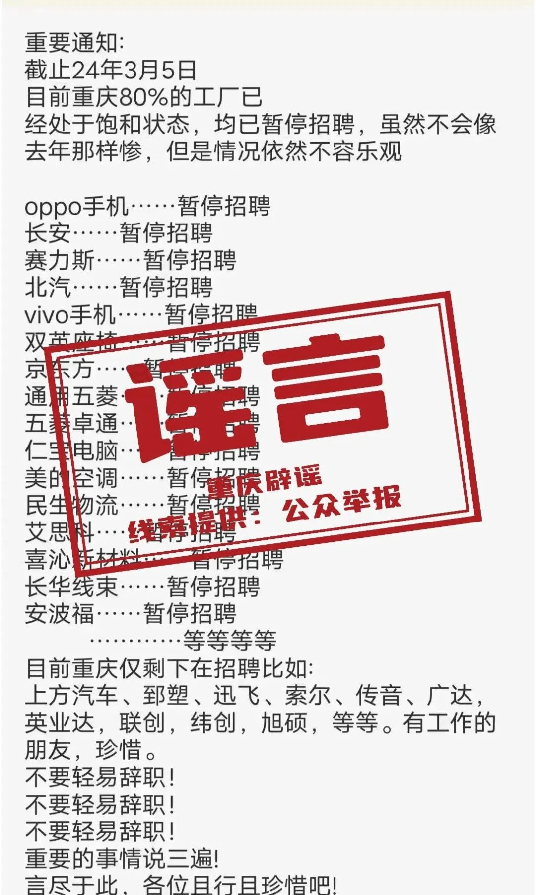 近日,有網(wǎng)民在某網(wǎng)絡平臺上發(fā)布信息:“目前重慶市80%的廠已處于飽和狀態(tài),均已暫停招聘”,引發(fā)社會關(guān)注。經(jīng)相關(guān)部門核實,網(wǎng)傳信息為謠言。