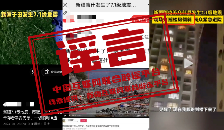 詳情:1月23日2時9分,新疆阿克蘇地區(qū)烏什縣發(fā)生7.1級地震。隨后,關于此次地震的各種不實信息在網絡上傳播,混淆視聽、引發(fā)關注。針對“新疆喀什發(fā)生7.1級地震”“新疆和田地區(qū)于田縣發(fā)生7.1級地震”的網傳信息,經喀什市應急管理局和于田縣應急管理局證實,1月23日兩地均未發(fā)生地震,信息為虛假不實內容;針對“阿克蘇某小區(qū)樓被地震晃歪了”的圖文信息,經相關部門核實,圖片中的建筑物為阿克蘇市鳳凰城小區(qū)居民樓,排查暫未發(fā)現(xiàn)地震造成該樓體傾斜,網傳圖片系建筑物樓體設計和拍攝角度造成的樓體傾斜視覺錯誤;針對上述圖片和視頻顯示的“烏什縣路面損毀嚴重、房屋連片倒塌”相關信息,經查是網民利用AI自動生成技術,將烏什縣7.1級地震有關信息與網絡舊圖合成的虛假信息。中國互聯(lián)網聯(lián)合辟謠平臺提醒廣大網民,以官方發(fā)布信息為準,自覺抵制網絡謠言。(來源:“和田網絡舉報辟謠”微信公眾號、“喀什市零距離”微信公眾號、“阿克蘇網絡舉報”微信公眾號)