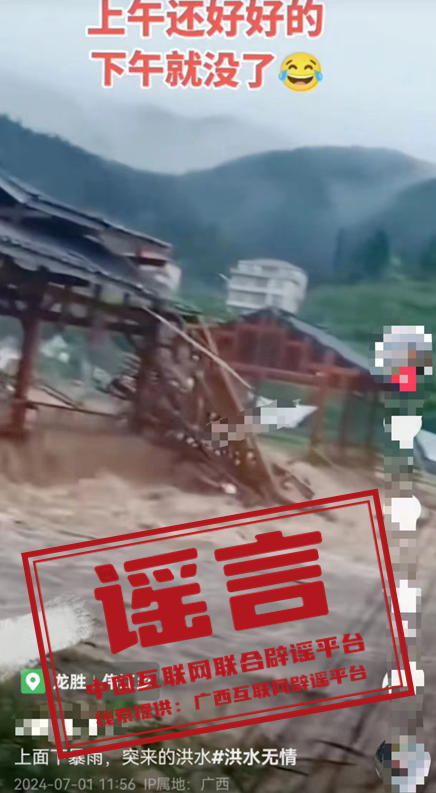 詳情:近日,有網(wǎng)民發(fā)布視頻稱“桂林龍勝一風(fēng)雨橋被洪水沖毀”,并配文“上午還好好的,下午就沒(méi)了”,引發(fā)關(guān)注。經(jīng)當(dāng)?shù)毓膊块T核實(shí),偉江鄉(xiāng)轄區(qū)內(nèi)風(fēng)雨橋完好無(wú)損,不存在倒塌的情況。該視頻系當(dāng)?shù)鼐W(wǎng)民龍某某罔顧事實(shí)、故意編造,將網(wǎng)上看到的其他地方的風(fēng)雨橋被毀視頻重新編輯并定位在偉江鄉(xiāng)進(jìn)行發(fā)布。目前,警方已依法對(duì)龍某某予以行政處罰。(來(lái)源:廣西互聯(lián)網(wǎng)辟謠平臺(tái)、龍勝公安)