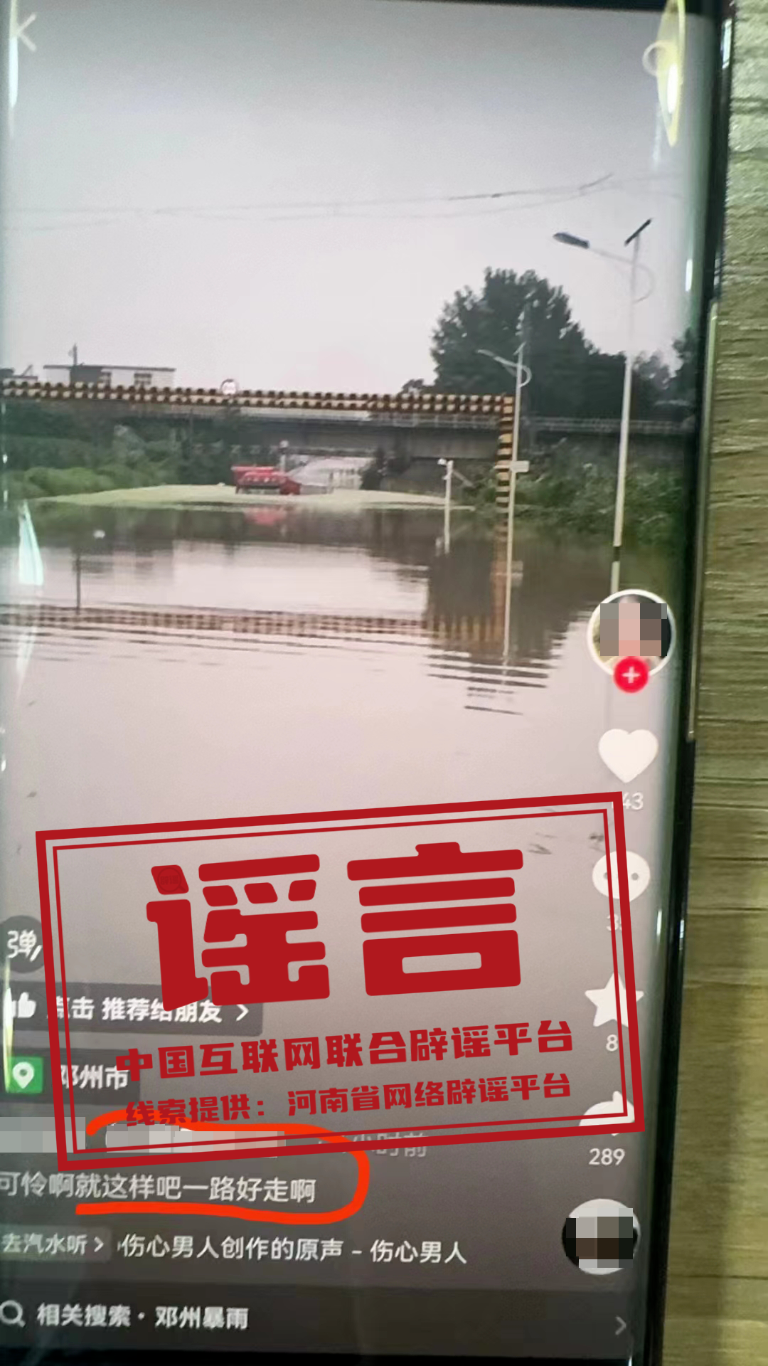 7月15日,網(wǎng)民“神x”在某短視頻平臺發(fā)布“貨車司機被淹”視頻,并配文稱“可憐啊,就這樣吧,一路好走”。經(jīng)核實,7月14日,鄧州市鐵路橋下一外地牌照貨車被淹,車內(nèi)被困人員已被成功救出,無人員傷亡,該信息與事實嚴(yán)重不符,系虛假信息。