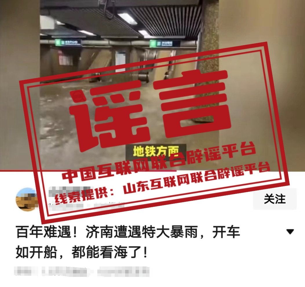 真相:7月22日,一則內(nèi)容為“百年難遇!濟(jì)南遭遇特大暴雨,開(kāi)車(chē)如開(kāi)船”的視頻信息在網(wǎng)絡(luò)傳播,視頻中還摻雜“車(chē)庫(kù)倒灌”“地鐵被淹”等水災(zāi)畫(huà)面。經(jīng)當(dāng)?shù)叵嚓P(guān)部門(mén)核實(shí),濟(jì)南市氣象臺(tái)于22日11時(shí)解除雷雨大風(fēng)黃色預(yù)警信號(hào),當(dāng)日并未出現(xiàn)特大降雨情況。視頻中的地鐵、街道等場(chǎng)景不在濟(jì)南。該視頻信息為謠言。(來(lái)源:山東互聯(lián)網(wǎng)聯(lián)合辟謠平臺(tái)、濟(jì)南互聯(lián)網(wǎng)聯(lián)合辟謠平臺(tái))