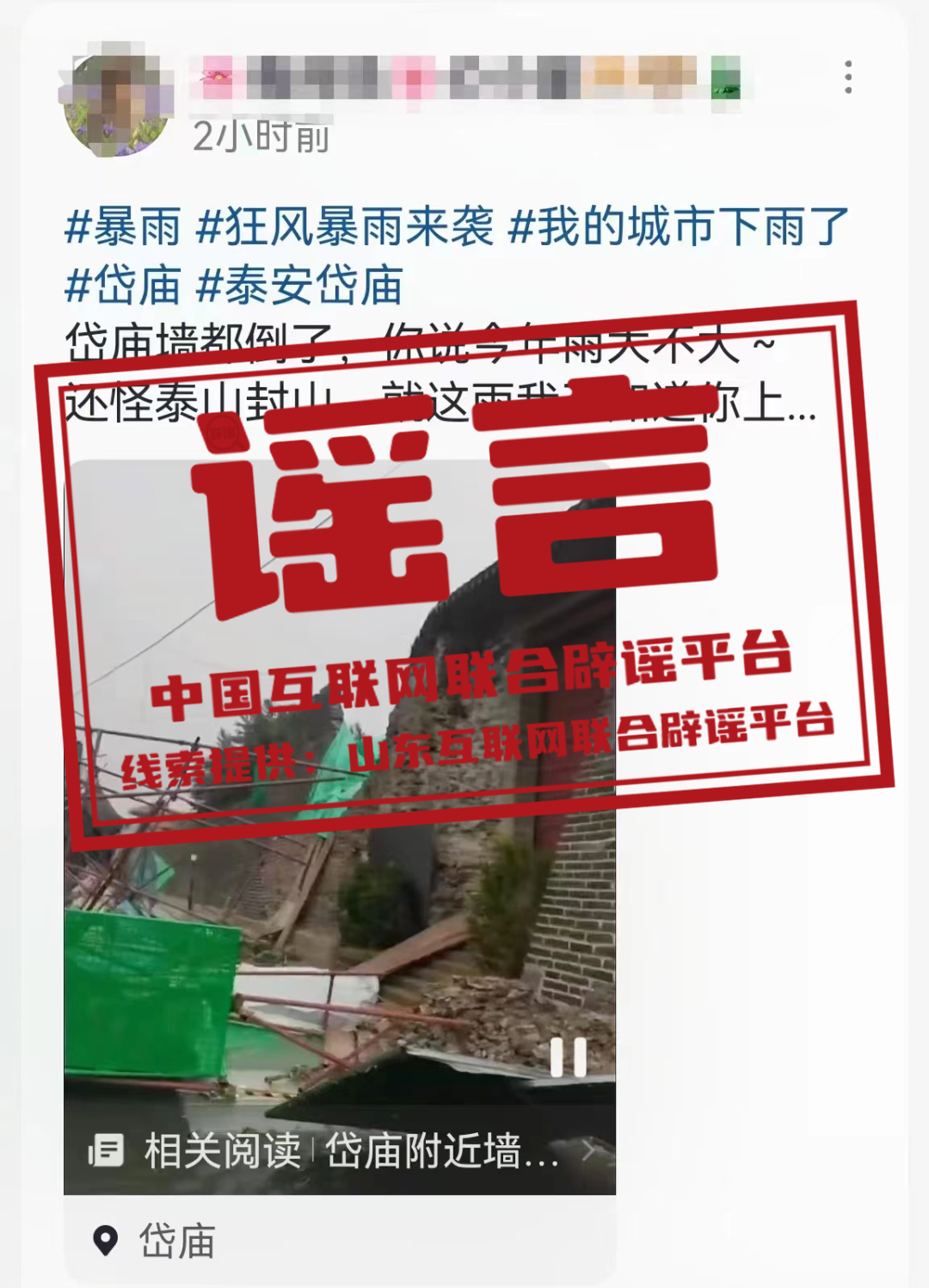 謠 言 山東泰安岱廟古城墻坍塌?