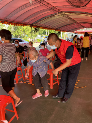 阜沙鎮(zhèn)綜合治理辦主任關(guān)國勝協(xié)助長者開展核酸檢測工作。